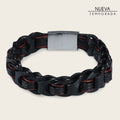 Pulsera para caballero. Presenta piel genuina de lizard y piel de bovino entretejidas de manera artesanal con contraste de color. Ajustada con broche de acero inoxidable. . Diámetro aproximado: 6.3 cm.