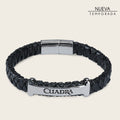 Pulsera para caballero con trenzado en piel genuina de lizard y piel de bovino con contraste de color. Cuenta con herraje del logotipo Cuadra. Ajustada con broche de imán de acero inoxidable. Diámetro aproximado: 6.3 cm.