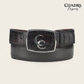 Cinturón vaquero Orígenes para caballero en piel genuina de fuscus sobre la hebilla y en la punta de la tira y piel de bovino. Con acabado pintado a mano sobre la piel exótica y sombreado. Hebilla forrada en piel de fuscus con aplicación metálica doble de monograma Cuadra. Con forro en piel de bovino.