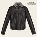 Chamarra para caballero en piel genuina de ovino. Presenta dos bolsillos laterales, dos en el área del pecho y un bolsillo interno. Con pelo genuino en cuello y parte interna. Ajustada con broches de presión en puños y al frente.