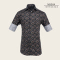 Camisa Cuadra para caballero. Presenta estampado en motivos florales con contraste de color. Con botones en mangas y al frente.- Hecha 100% de algodón.