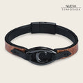 Pulsera para caballero en piel genuina de lizard con aplicaciones de piel genuina de bovino y tejido. Ajustada con broche de imán. Al centro con herraje del monograma Cuadra. Diámetro aproximado: 6.3 cm.