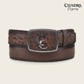 Cinturón vaquero Orígenes para caballero en piel genuina de avestruz sobre la hebilla y en la punta de la tira y piel de bovino. Con sombreado a mano a lo largo de la tira. Hebilla forrada en piel de avestruz con aplicación metálica doble de monograma Cuadra. Con forro en piel de bovino.