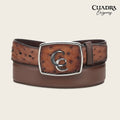 Cinturón vaquero Orígenes para caballero en piel genuina de avestruz sobre la hebilla y en la punta de la tira y piel de bovino. Con sombreado a mano a lo largo de la tira. Hebilla forrada en piel de avestruz con aplicación metálica doble de monograma Cuadra. Con forro en piel de bovino.