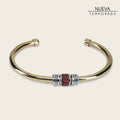 Pulsera ajustable para dama en  latón con baño de oro. Con aplicación de cuentas metálicas en acabado oro forradas en piel genuina de lizard y componentes Cuadra en acabado platino. Diámetro aproximado: 6.3 cm.