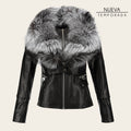 Chamarra para dama en piel genuina de cordero. Presenta dos bolsillos laterales asegurados con broches y tejido capitonado a los costados. Con pelo de zorro desmontable para usar como chaleco. Ajuste con cierre al frente y en mangas.