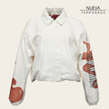 Chamarra para dama en piel genuina de cordero. Presenta estampado en contraste de color, dos bolsillos laterales y elástico en puños y borde inferior. A justada con cierre y broche.