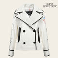 Chamarra para dama en piel genuina de cordero. Presenta estampado en contraste y dos bolsillos laterales con cierre. Ajustada con botones al frente y en los puños.