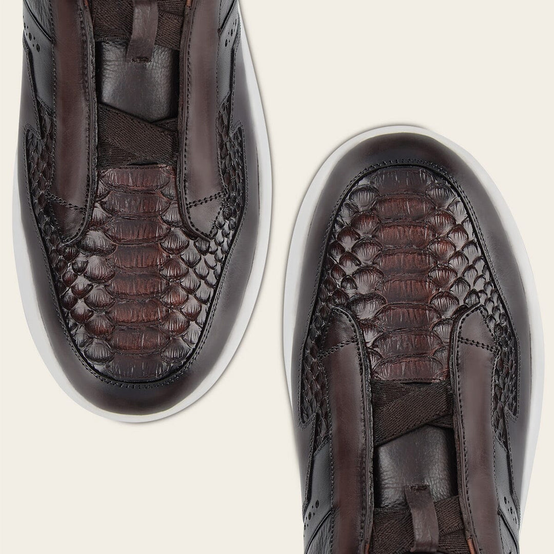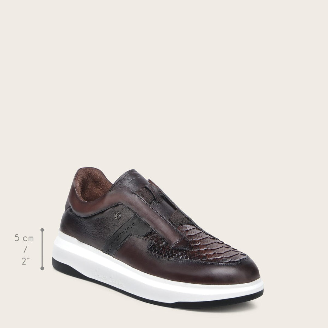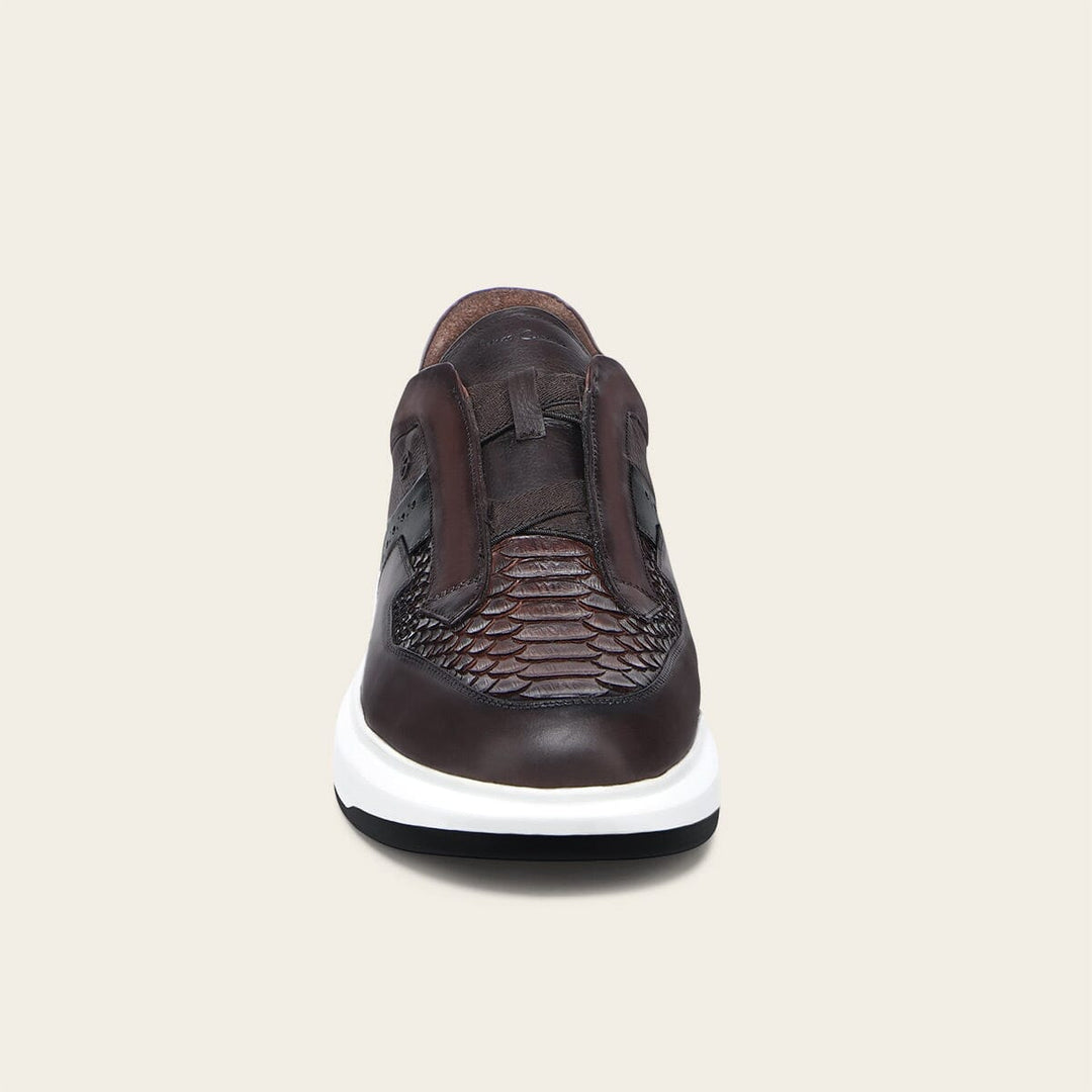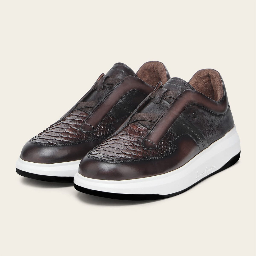 Tenis slip-on ultra ligeros para caballero en piel genuina de pitón y piel de bovino. Presenta aplicación del monograma Franco Cuadra al costado, sombreado pintado a mano, contraste de color, brocado y acabado anticado. Con elástico en la lengüeta para mejor ajuste. Con suela bicolor de EVA.