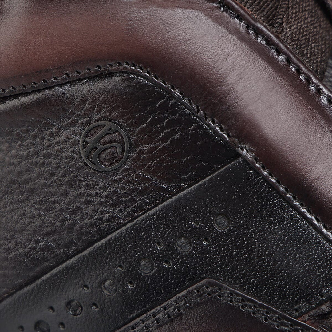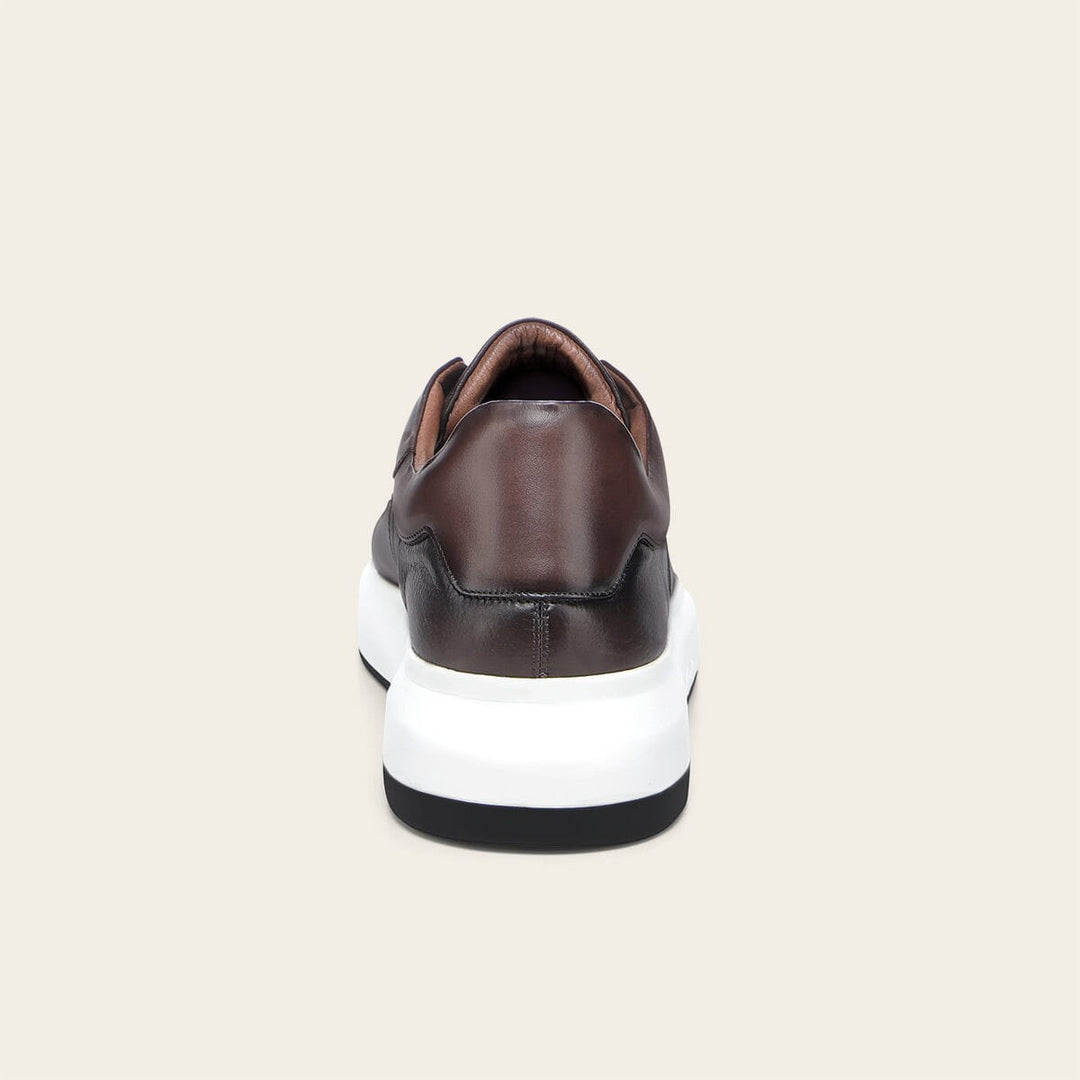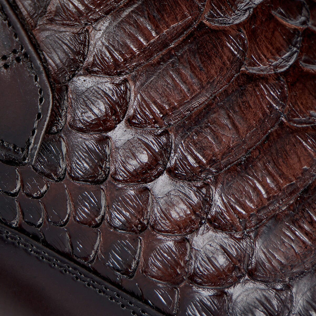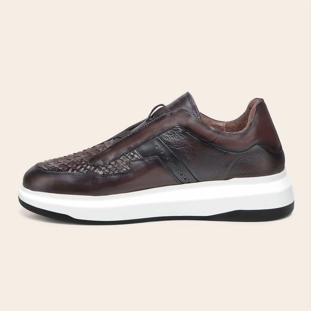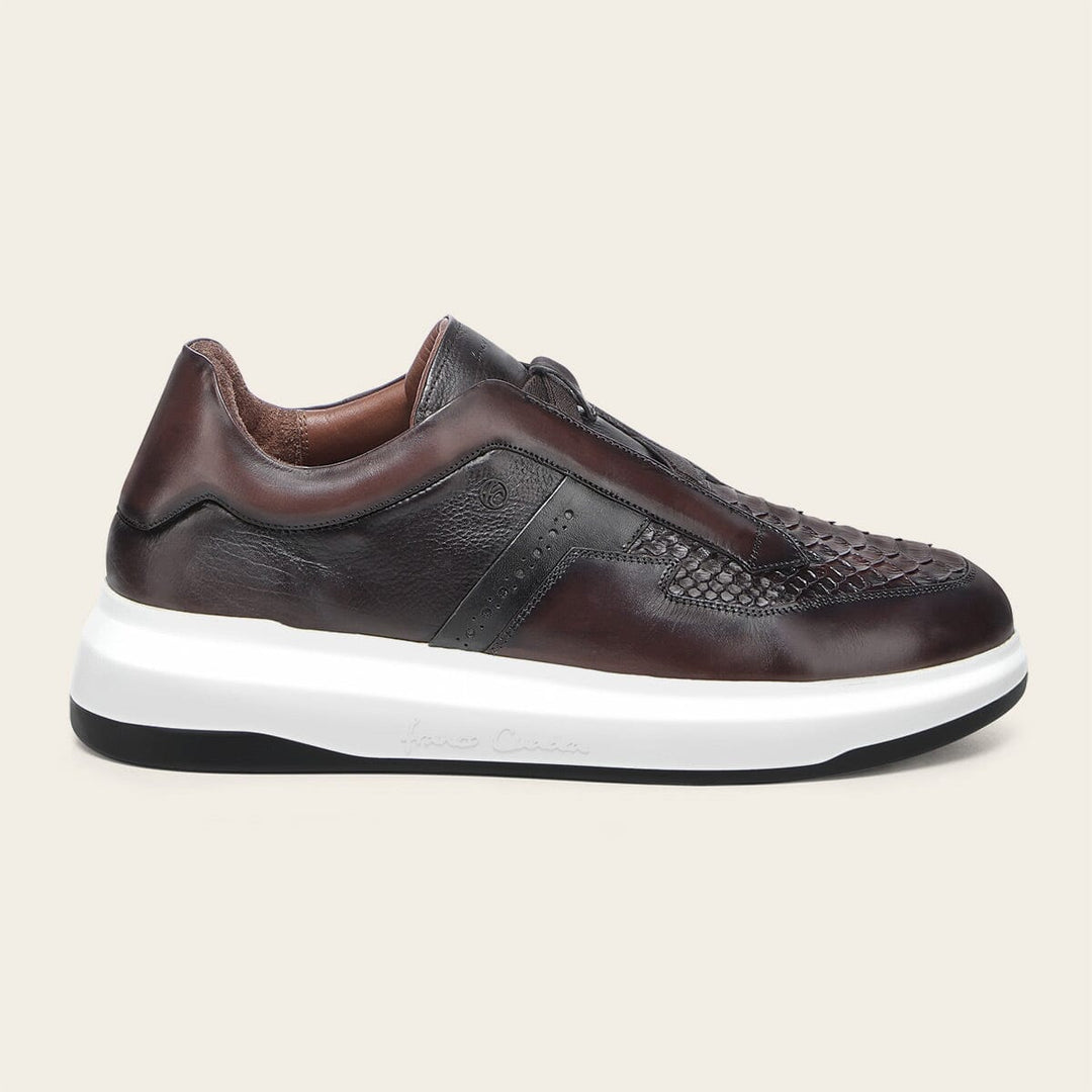 Tenis slip-on ultra ligeros para caballero en piel genuina de pitón y piel de bovino. Presenta aplicación del monograma Franco Cuadra al costado, sombreado pintado a mano, contraste de color, brocado y acabado anticado. Con elástico en la lengüeta para mejor ajuste. Con suela bicolor de EVA.