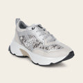 Sneakers para dama en piel genuina de pitón y bovino. Con acabado metálico. Al costado presenta aplicaciones en tela y hule con monograma de Franco Cuadra en texturas contrastantes. Ajustados con agujetas frontales. Con suela bi color inyectada XL EXTRALIGHT® DUAL COLOR compuesta de EVA, reconocida por su ligereza, resistencia al calor, flexibilidad y confort.