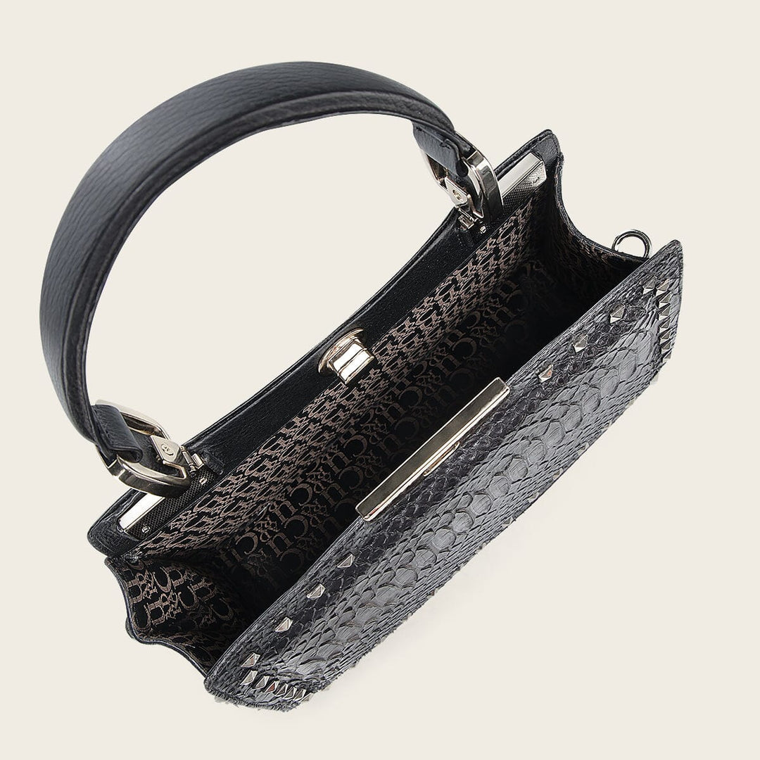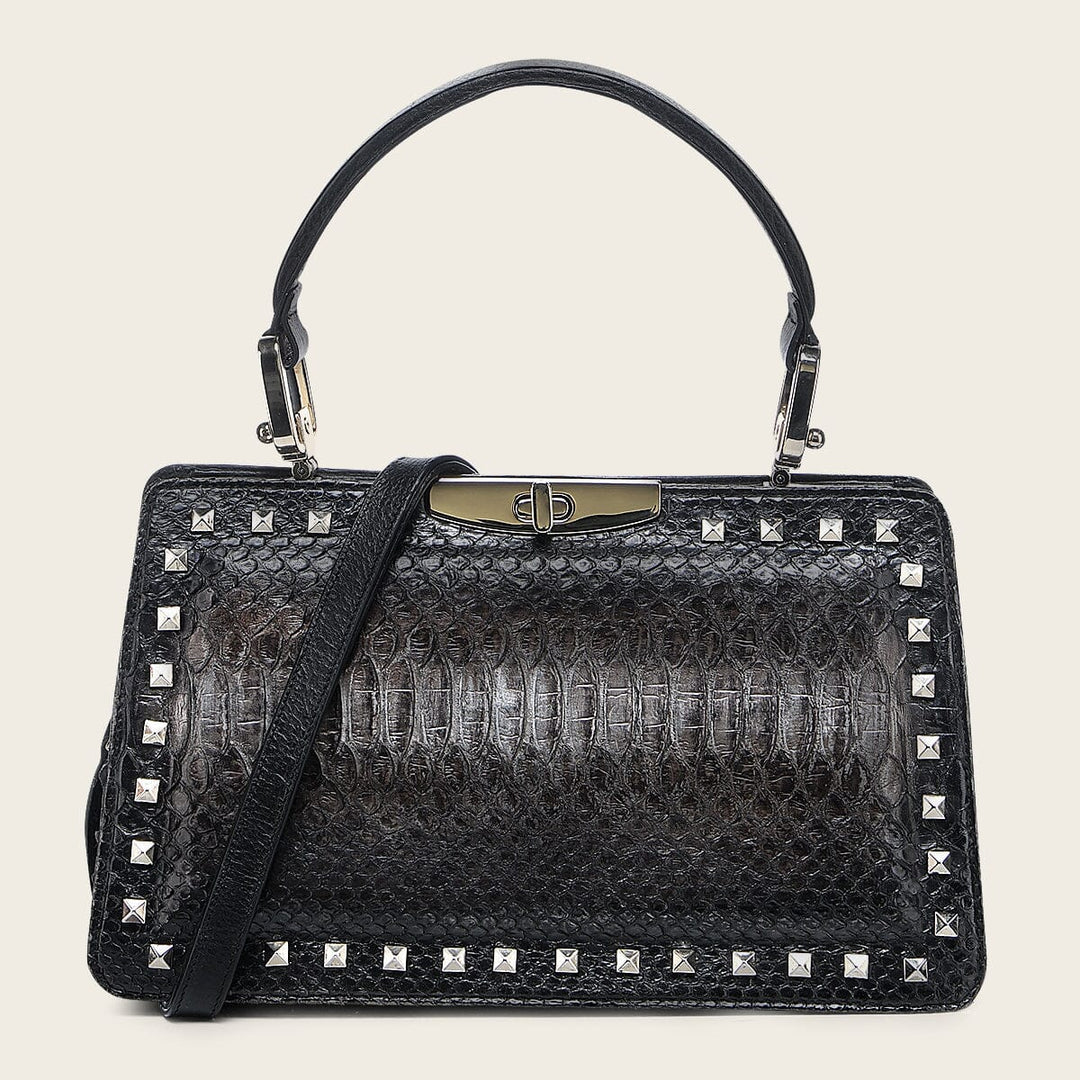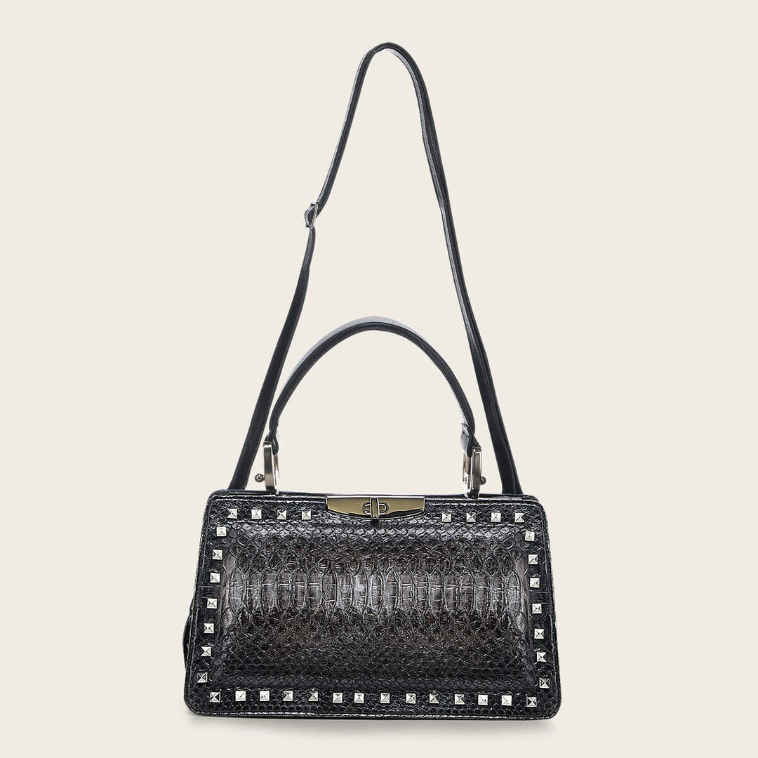 Bolso de mano para dama en piel genuina de pitón y piel de bovino con combinación de colores y acabado tornasol. Presenta aplicación de estoperoles en el margen al frente y atrás. Asa corta y asa