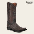 Bota vaquera Orígenes para caballero en piel genuina de avestruz y bovino. Presenta herraje metálico del monograma de la marca sobre piel genuina de avestruz, bordado en alto relieve, tejido artesanal y grabado láser en motivos orgánicos. Cuenta con el logotipo Cuadra en el costado y en la parte trasera, la leyenda “Cuadra Tradicional”. Con piel genuina de avestruz en las orejas. Suela de cuero con injerto de TPU antiderrapante.