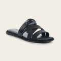 Sandalia slip-on para dama en piel genuina de mantarraya y piel de bovino. Presenta tiras de piel con hebilla metálica decorativa. Cuenta con una plantilla Ortholite reconocida por su transpirabilidad, amortiguación, control de humedad y confort. Con suela de cuero con injerto de TPU.