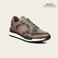 Tenis para caballero en piel genuina de pitón y piel de becerro. Presenta texturas y colores contrastantes, sombreado a mano, grabado del logotipo Franco Cuadra en la parte trasera y sobre una aplicación de piel en la lengüeta. Ajustado con agujetas. Con suela bicolor de hule con injerto de TPU.