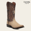 Bota vaquera Orígenes para caballero en piel genuina de avestruz y bovino. Presenta sombreado a mano, herraje metálico del monograma de la marca sobre piel genuina de avestruz bordado en alto relieve, tejido artesanal y grabado láser en motivos orgánicos. Cuenta con el logotipo Cuadra en el costado y en la parte trasera, la leyenda “Cuadra Tradicional”. Con piel genuina de avestruz en las orejas. Suela de cuero con injerto de TPU antiderrapante.
