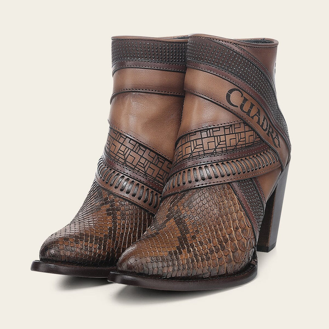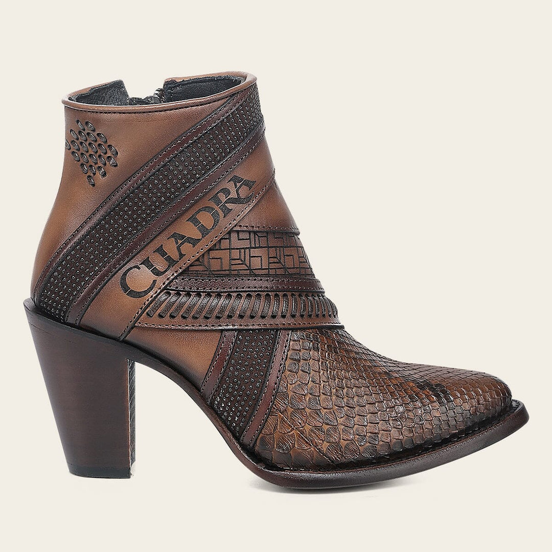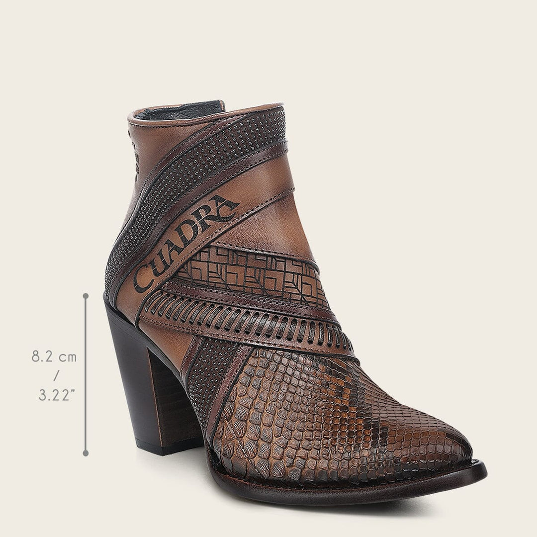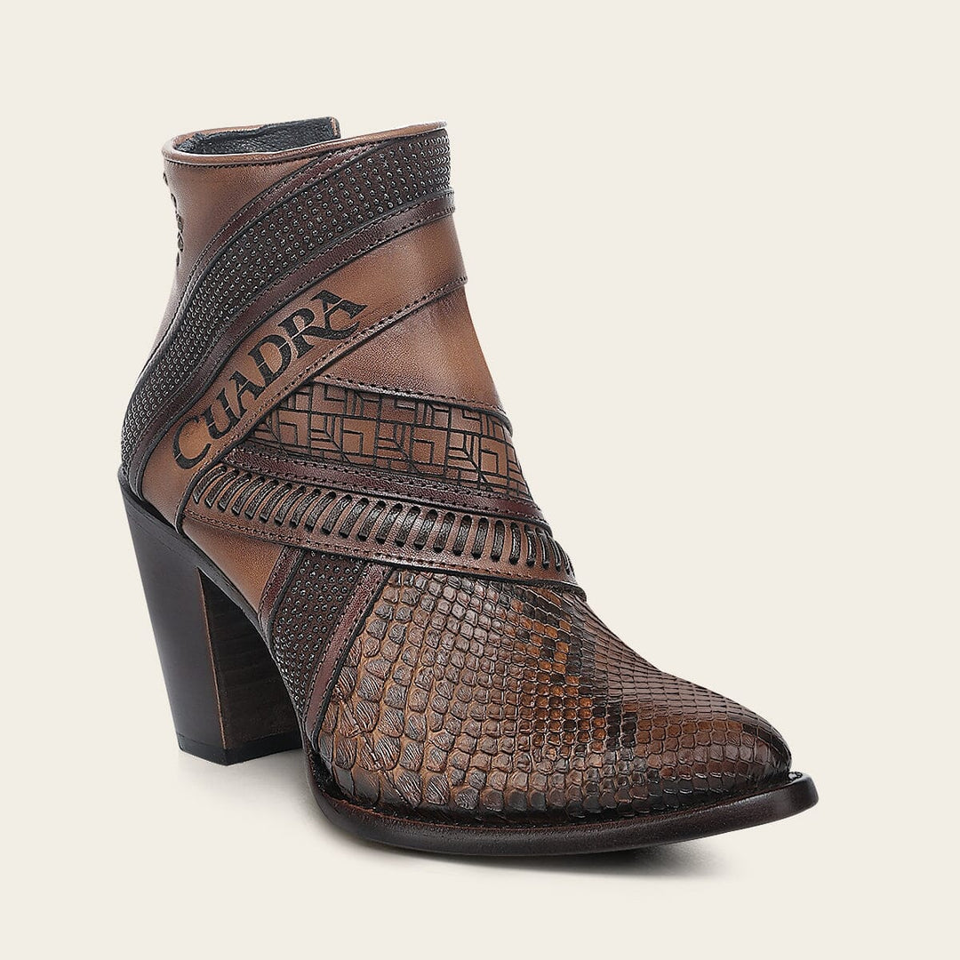 Botín para dama en piel genuina de pitón y piel de bovino. Presenta detalles de tejido artesanal, grabado láser en motivos geométricos y del logotipo Cuadra. Con aplicaciones que otorgan contraste de texturas y sombreado a mano. Ajustado con cierre interno. Suela de cuero con injerto de TPU.