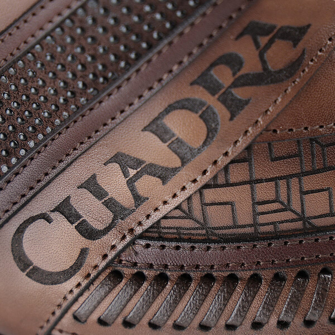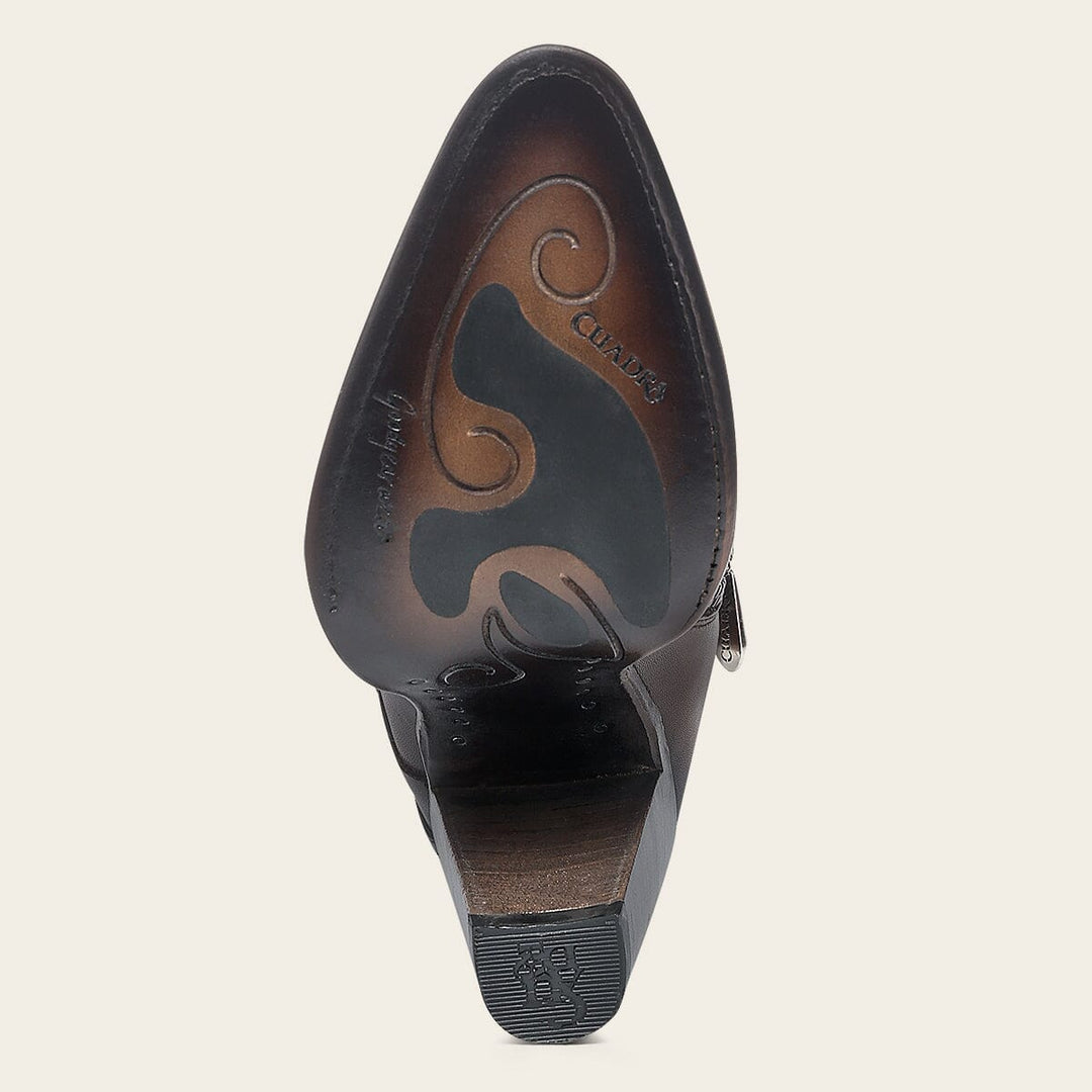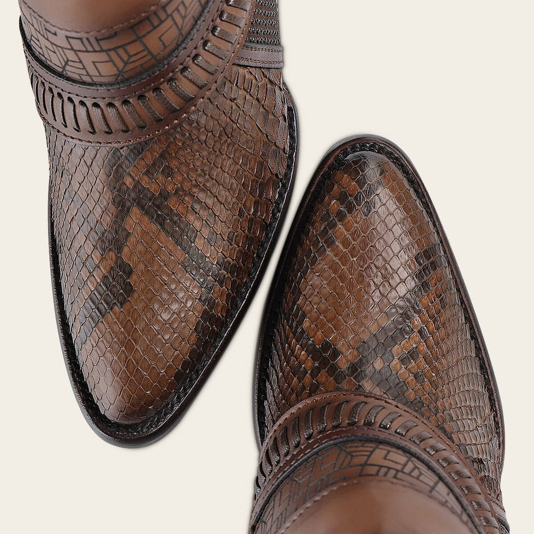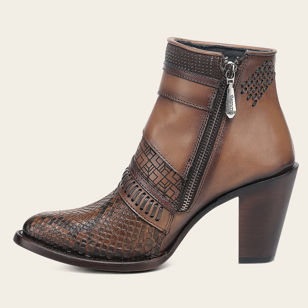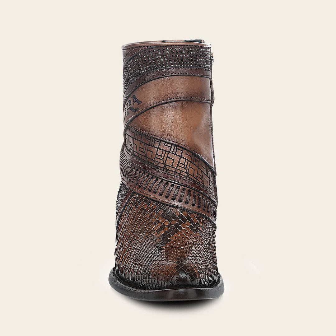 Botín para dama en piel genuina de pitón y piel de bovino. Presenta detalles de tejido artesanal, grabado láser en motivos geométricos y del logotipo Cuadra. Con aplicaciones que otorgan contraste de texturas y sombreado a mano. Ajustado con cierre interno. Suela de cuero con injerto de TPU.