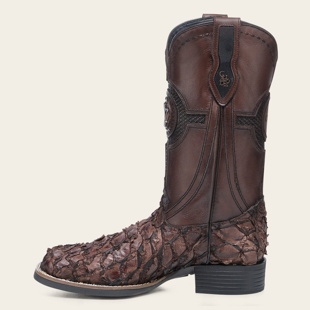 Bota rodeo Orígenes en piel genuina de pirarucu y piel de bovino para caballero. Presenta aplicaciones de KPU en motivos geométricos, tejido a modo artesanal en alto relieve, aplicación metálica del monograma Cuadra sobre piel genuina de pirarucu, aplicación del logotipo de la marca en alto relieve en orejas y grabado láser del logotipo Cuadra en la parte trasera. Cuenta con las nuevas tecnologías: platilla flexrider, planta Ortholite y suela flexrider, que le dan mayor ligereza, confort, transpirabilidad y amortiguación. Tubo suave diseñado con entretelas.