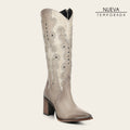 Bota western para dama en piel genuina de bovino. Presenta bordado en contraste de textura y color, estoperoles, ojillos, sombreado a mano y puntera metálica. Con aplicaciones de piel en textura y color contrastante. Ajustada con cierre interno. Suela con injerto antiderrapante.