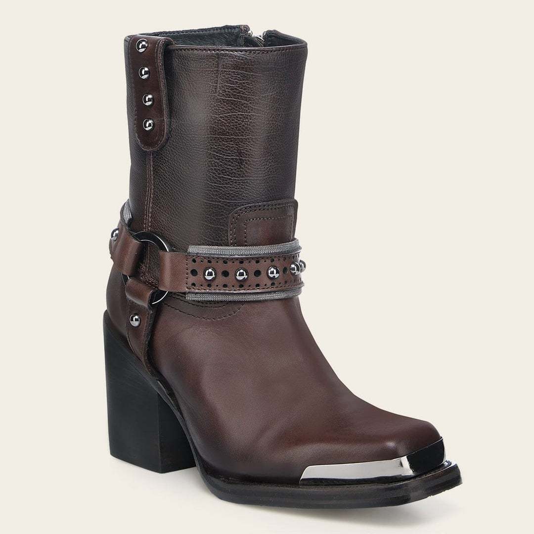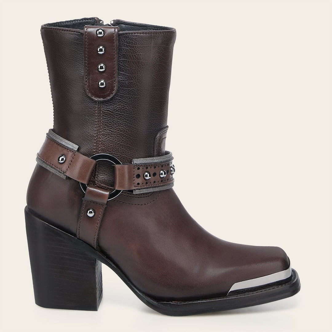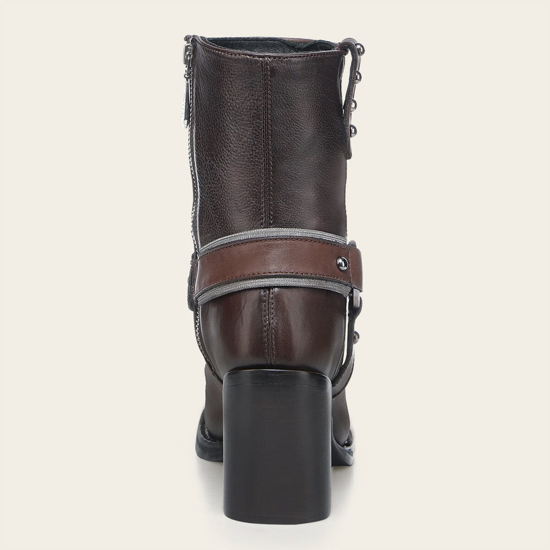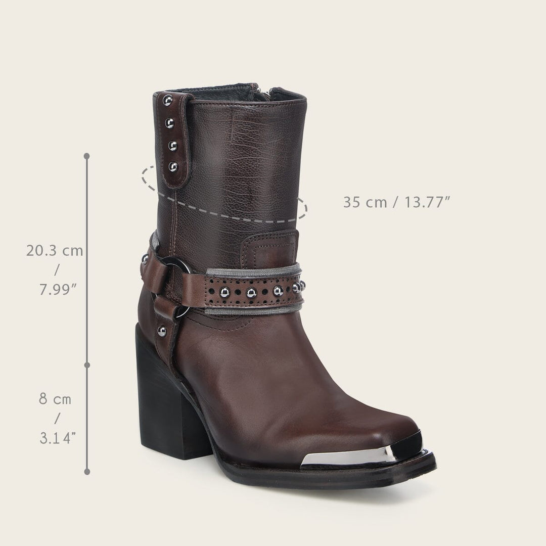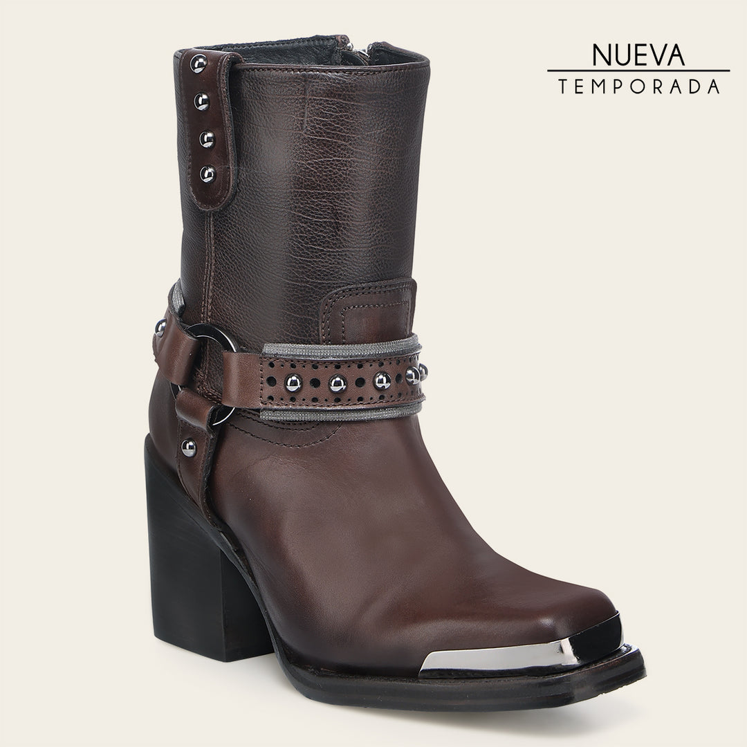 Botín biker para dama en piel genuina de bovino. Presenta correa decorativa alrededor del tobillo con herrajes y aplicación metálica en forma de herradura. En el costado presenta aplicación de estoperoles. Ajustada con cierre interno y aplicación elástica forrada en piel para mejor ajuste. Cuenta con las nuevas tecnologías: tubo con entretelas suaves, planta Ortholite y plantilla flex removible.