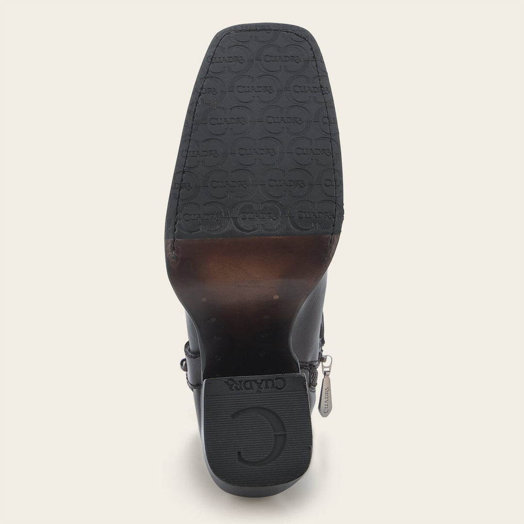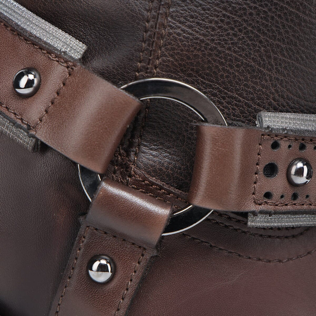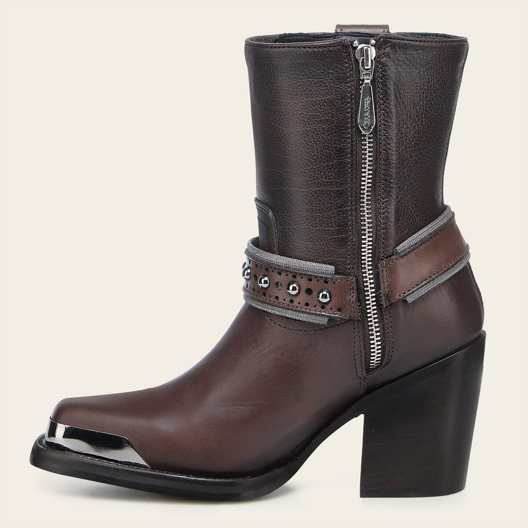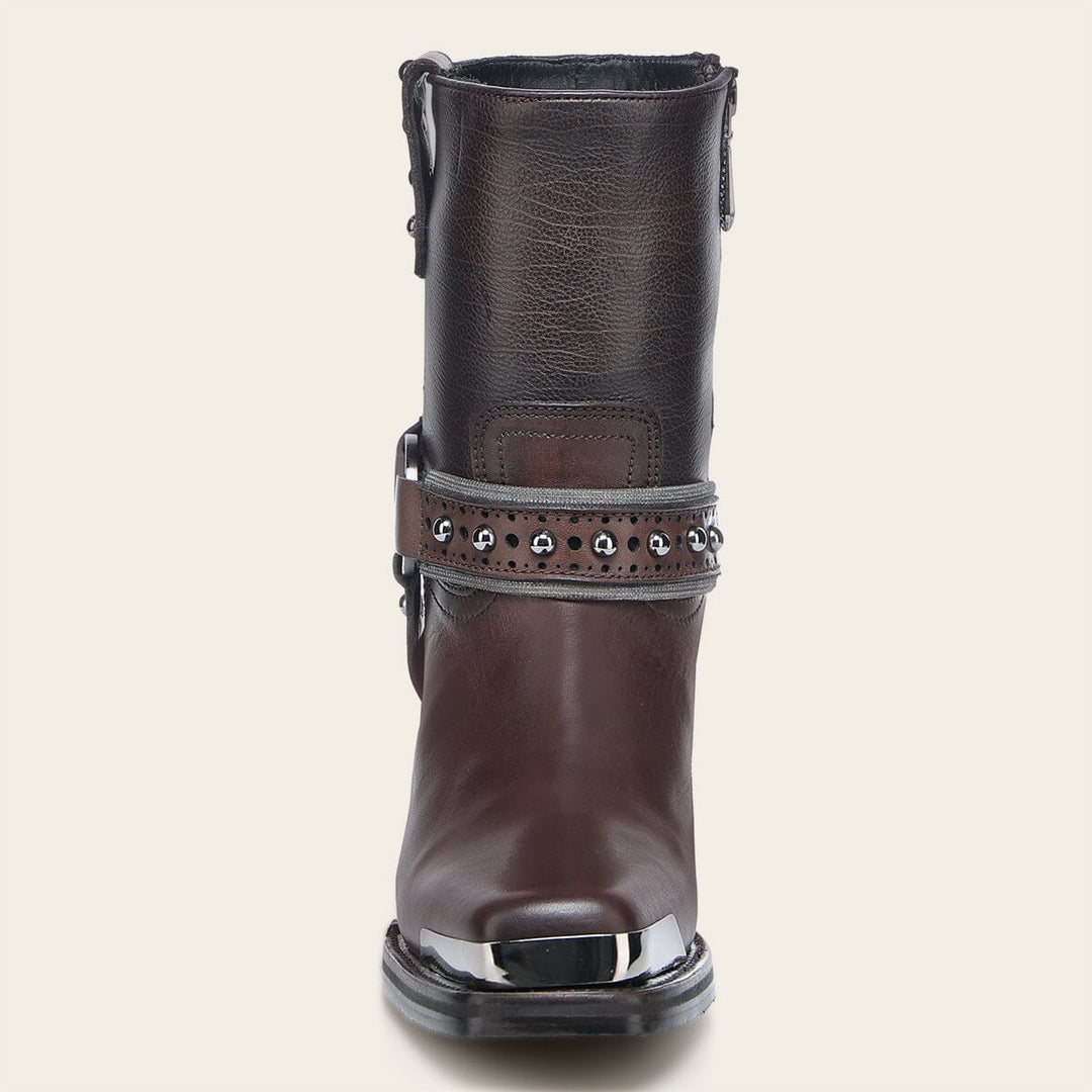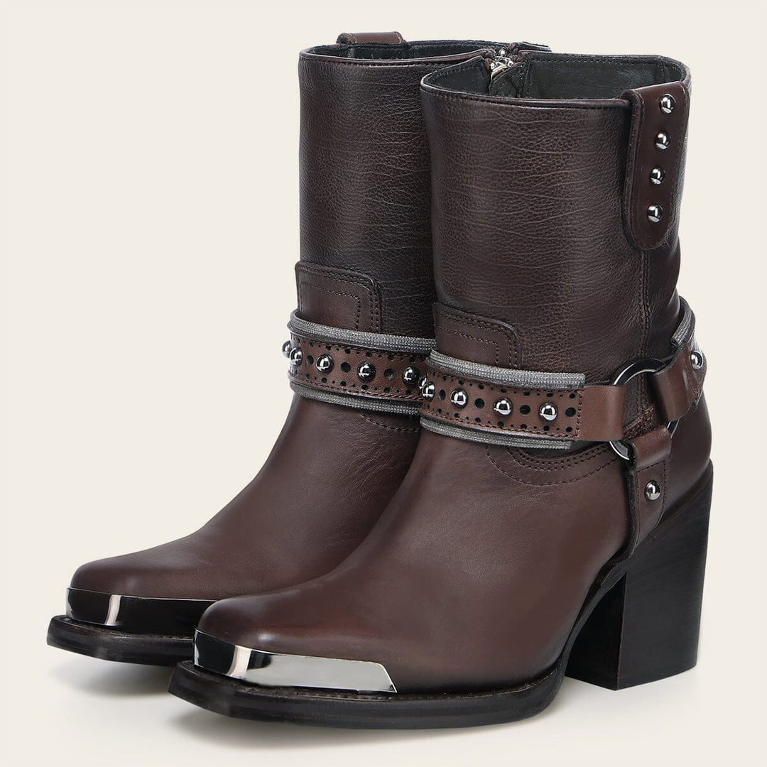 Botín biker para dama en piel genuina de bovino. Presenta correa decorativa alrededor del tobillo con herrajes y aplicación metálica en forma de herradura. En el costado presenta aplicación de estoperoles. Ajustada con cierre interno y aplicación elástica forrada en piel para mejor ajuste. Cuenta con las nuevas tecnologías: tubo con entretelas suaves, planta Ortholite y plantilla flex removible.