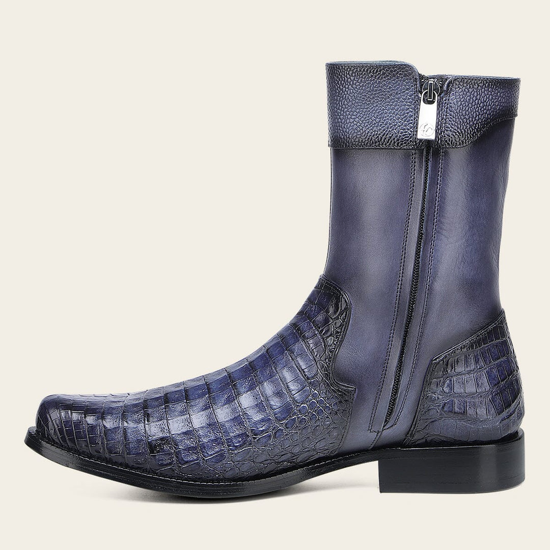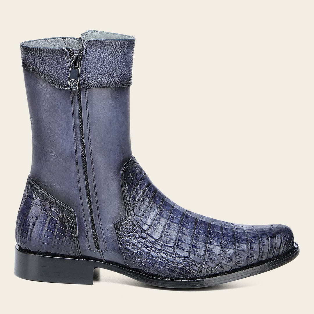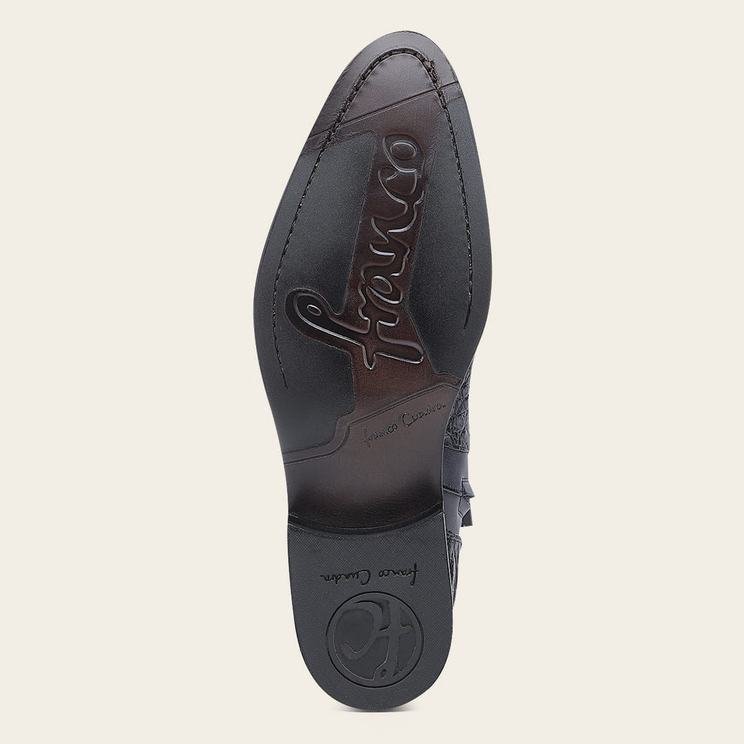 Bota de vestir para caballero en piel genuina de caimán y piel de bovino. Presenta grabado del logotipo Franco Cuadra y sombreado a mano. Ajustado con doble cierre a los costados. Con suela de cuero con injerto de TPU.