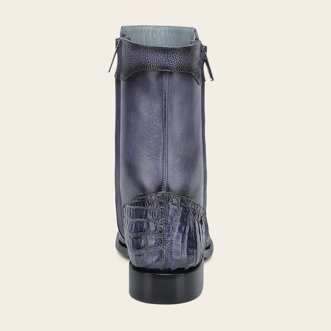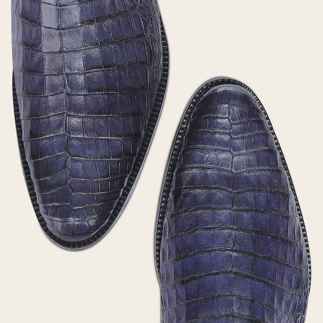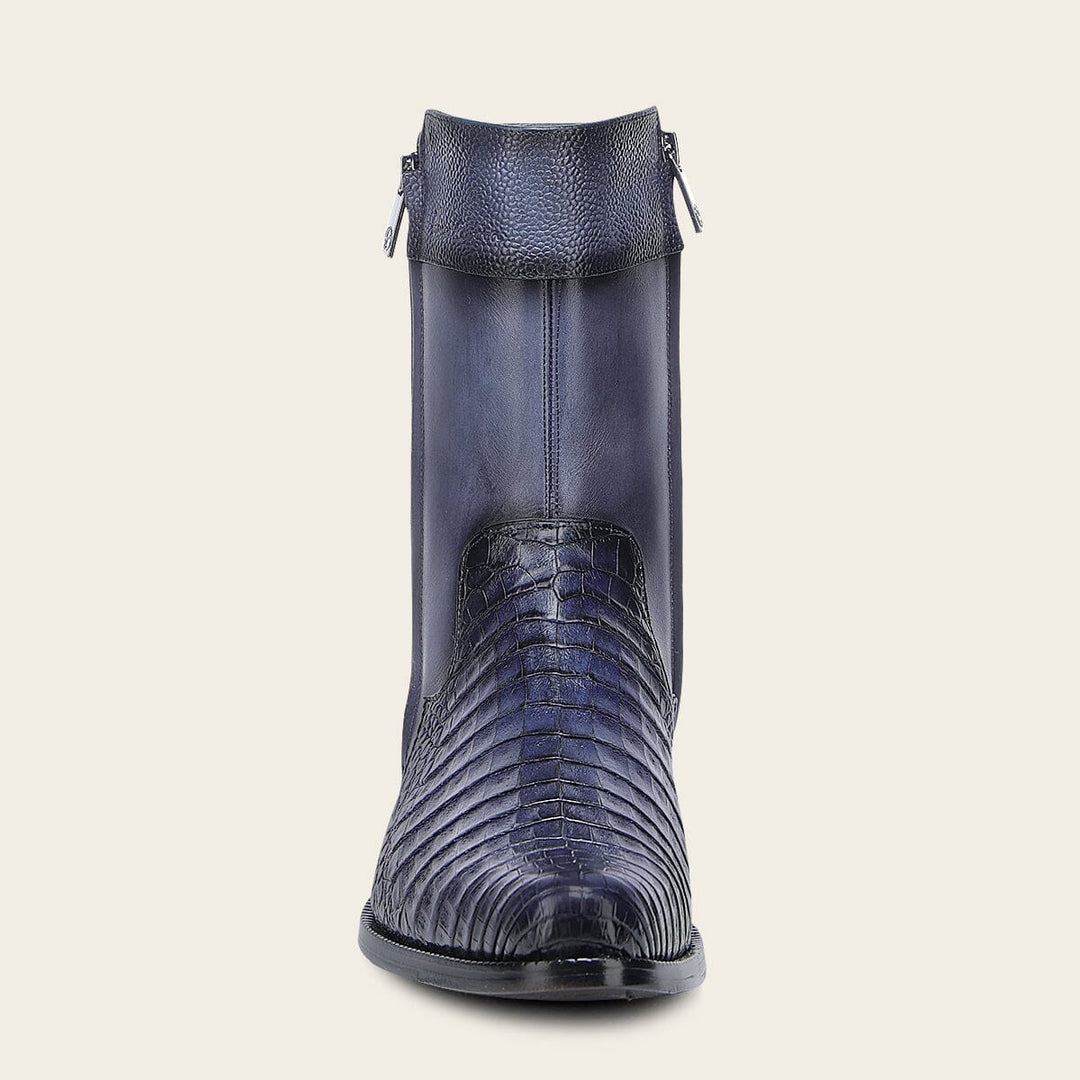Bota de vestir para caballero en piel genuina de caimán y piel de bovino. Presenta grabado del logotipo Franco Cuadra y sombreado a mano. Ajustado con doble cierre a los costados. Con suela de cuero con injerto de TPU.