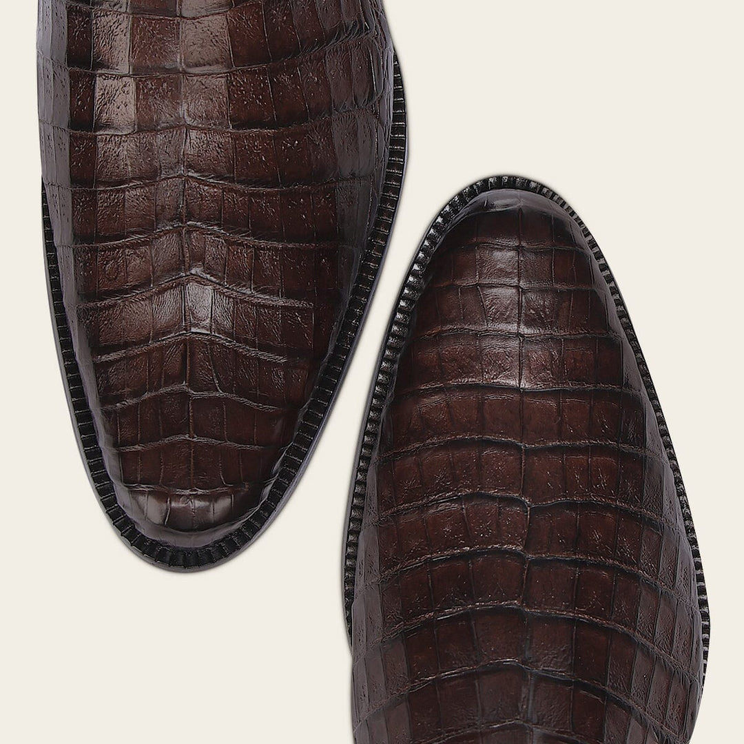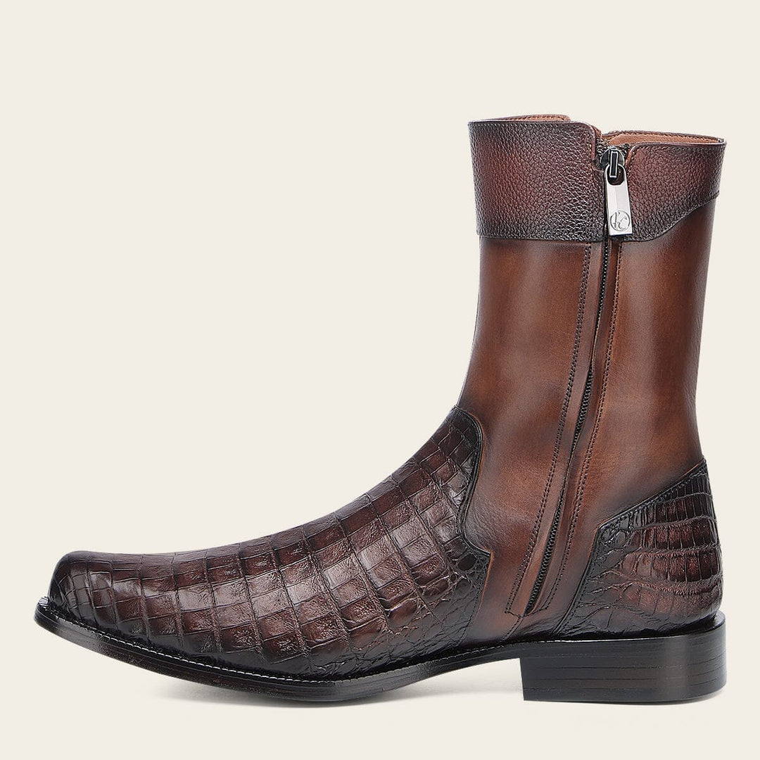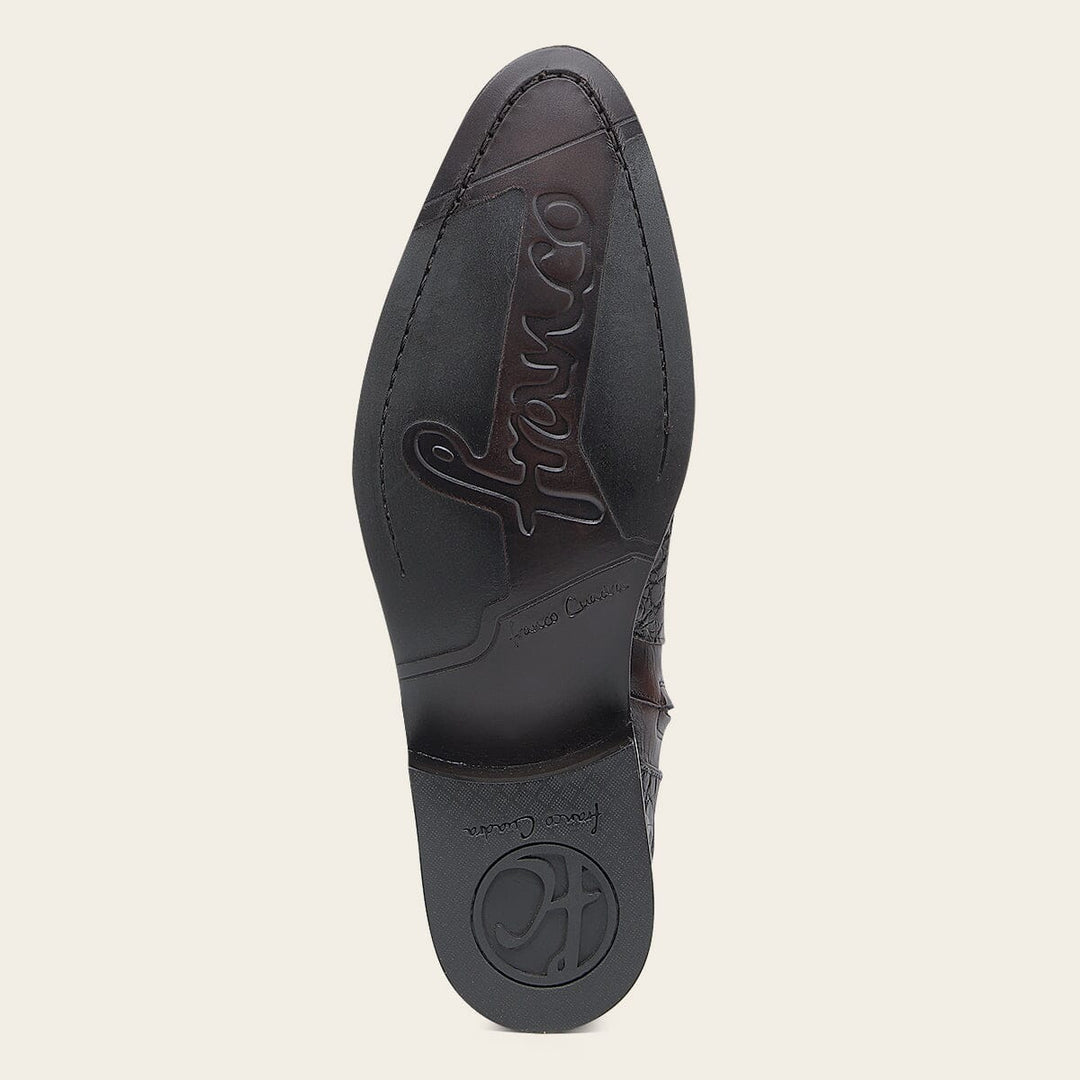 Bota de vestir para caballero en piel genuina de caimán y piel de bovino. Presenta grabado del logotipo Franco Cuadra y sombreado a mano. Ajustado con doble cierre a los costados. Con suela de cuero con injerto de TPU.