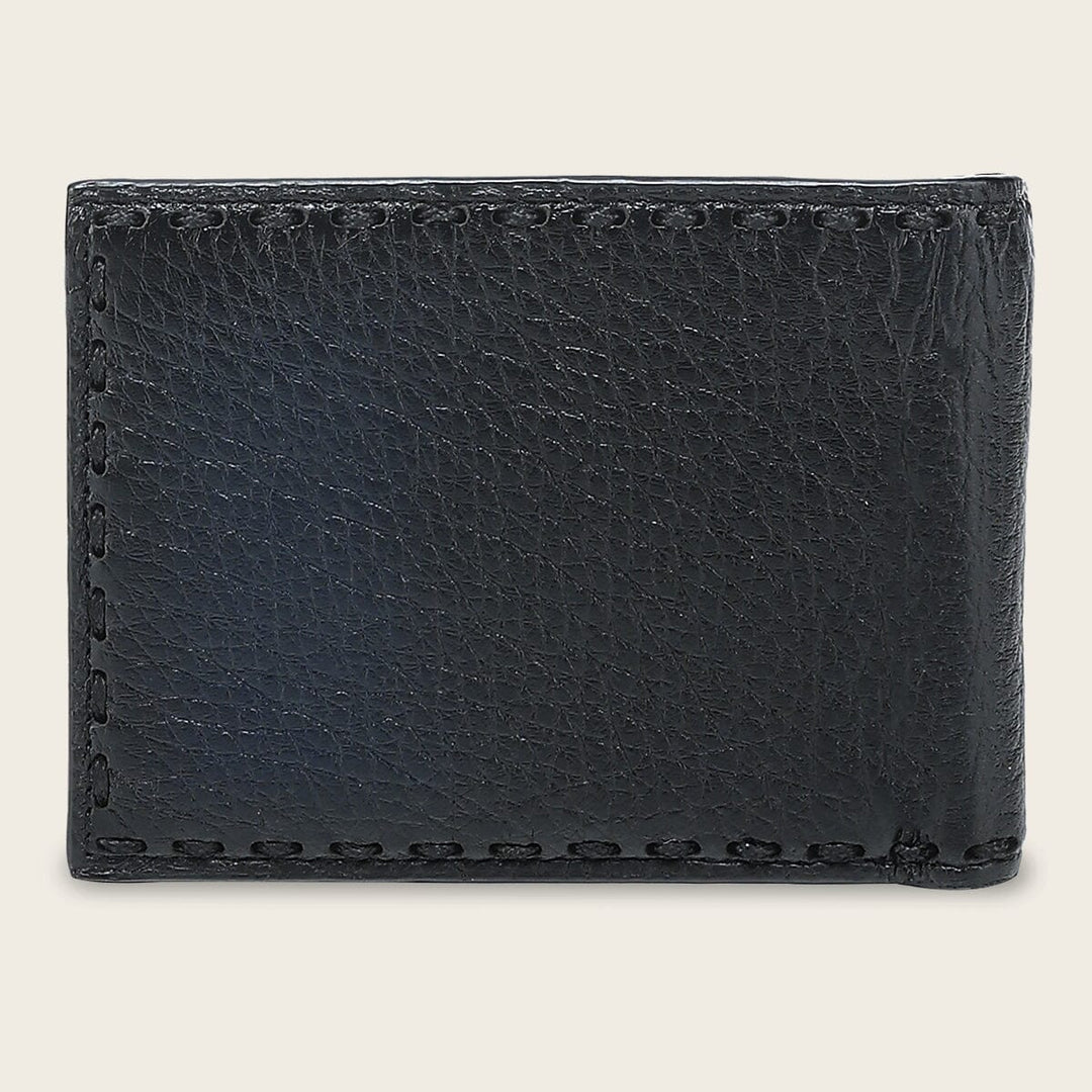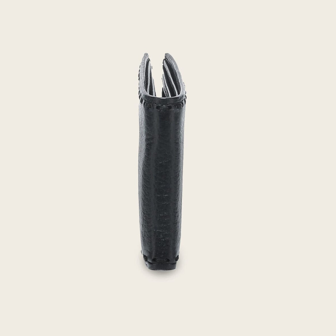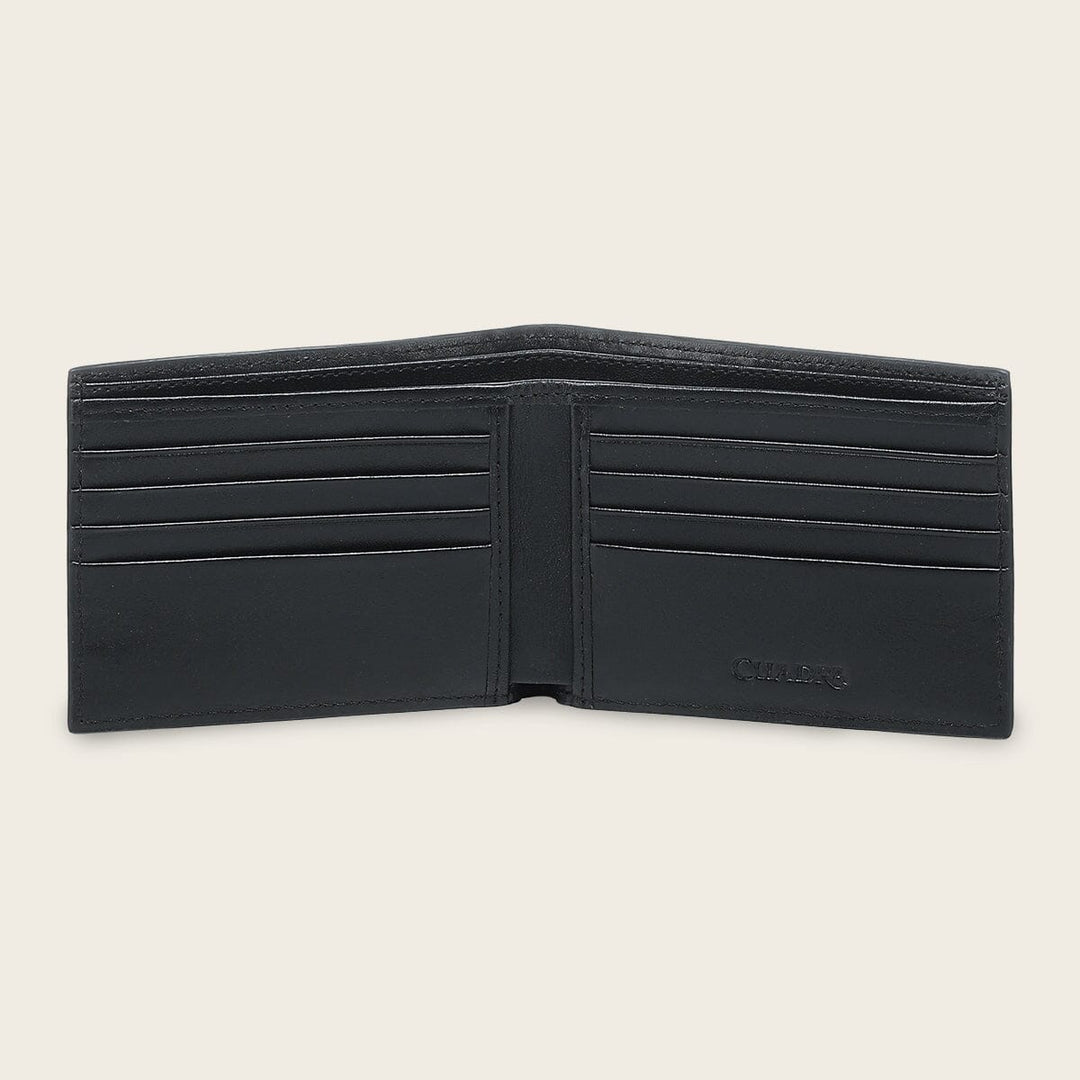 Cartera en piel genuina de venado para caballero. Al frente presenta detalles de tejido artesanal y aplicación metálica del logotipo Cuadra. En su interior cuenta con grabado del logotipo, ocho espacios para tarjetas y dos espacios para efectivo.