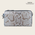 Cartera para dama en piel genuina de pitón y piel genuina de bovino. Aplicación metálica del logotipo Cuadra. Asegurada con broche. En su interior cuenta con diez tarjeteros, dos espacios para efectivo y un espacio para monedero.