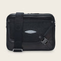 Bandolera para caballero en piel genuina de mantarraya y piel de bovino. Al frente presenta aplicación metálica de logotipo Cuadra. Cuenta con dos divisiones. La división del frente cuenta con un compartimento asegurado con cierre y broche. El compartimento trasero cuenta con dos espacios para tarjetas, asegurado con cierre. Con asa larga de tela ajustable y desmontable.