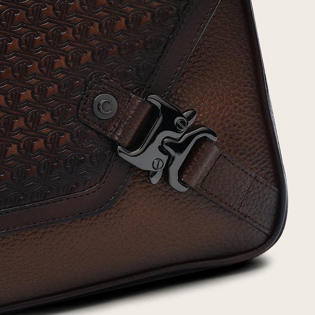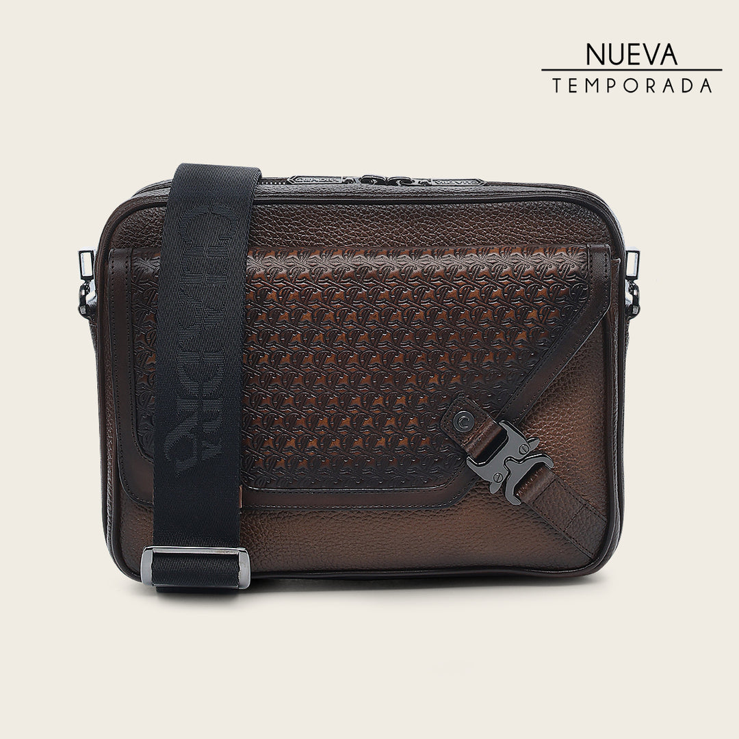 Bandolera para caballero en piel genuina de bovino. Al frente presenta aplicación metálica del logotipo y mini monograma Cuadra en alto relieve. Cuenta con dos divisiones. La división del frente cuenta con un compartimento asegurado con cierre y broche. El compartimento trasero cuenta con dos espacios para tarjetas, asegurado con cierre. Con asa larga de tela ajustable y desmontable.