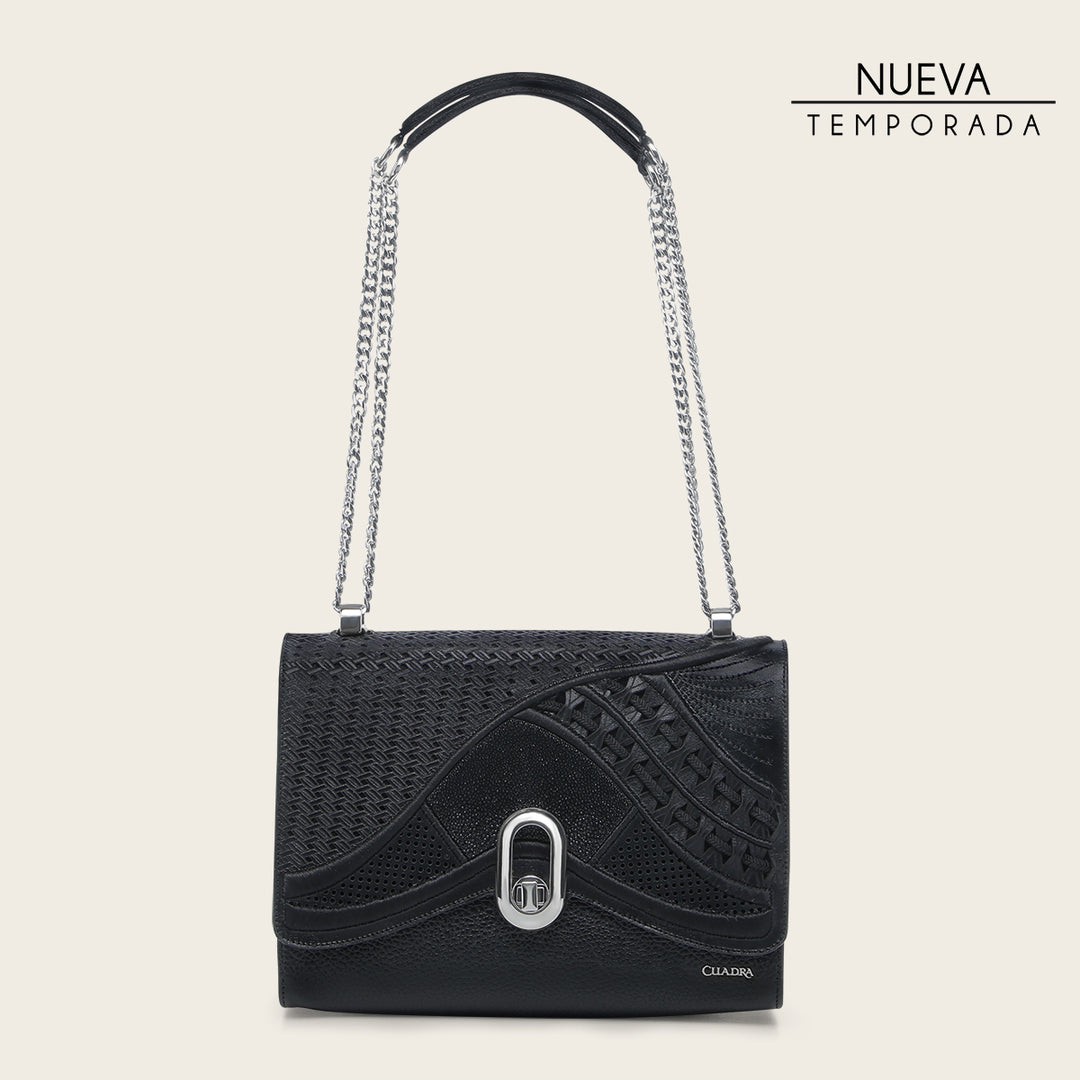 Bolso de hombro para dama en piel genuina de mantarraya y piel de bovino. Presenta grabado láser, bordado, tejido en alto relieve, trenza de textil. Dos compartimentos internos, uno asegurado con cierre. Ajuste con broche metálico. Con asa de cadena doble que puede alargase para usar como crossbody. Asegurado con broche.