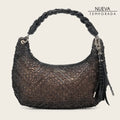 Bolso de hombro para dama en piel genuina de bovino. Presenta bordado bidimensional de tiras de piel y asa de mano en piel genuina trenzada de modo artesanal. Con borlas de piel de ovino colgantes trenzadas, con aplicaciones y puntas metálicas. La parte interna cuenta con dos compartimentos uno de ellos asegurado con cierre. Asegurado con cierre.