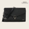 Bolso clutch para dama en piel genuina de mantarraya y piel de bovino. Presenta aplicación metálica del logotipo Cuadra, al costado una borla colgante en piel de ovino con finas cadenas y aplicación en piel de mantarraya. Con un compartimento interno. Asa de cadena con piel genuina, desmontable. Asegurado con broche.