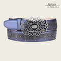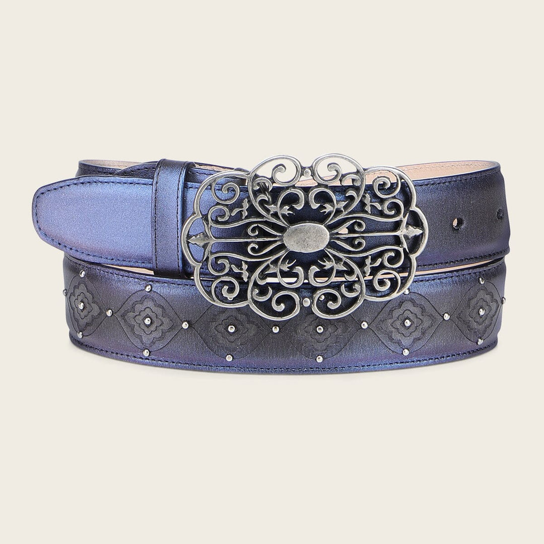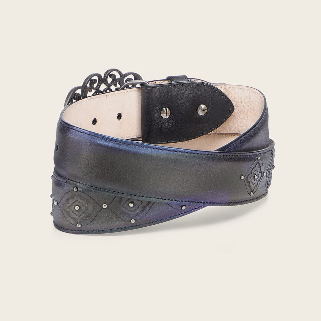 Cinturón para dama en piel de bovino. Presenta grabado láser en motivos florales y pequeños estoperoles metálicos a lo largo de la tira. Con hebilla metálica de 38 mm en motivos orgánicos. Forro de piel de bovino grabado con serigrafía de logotipo de Cuadra.
