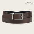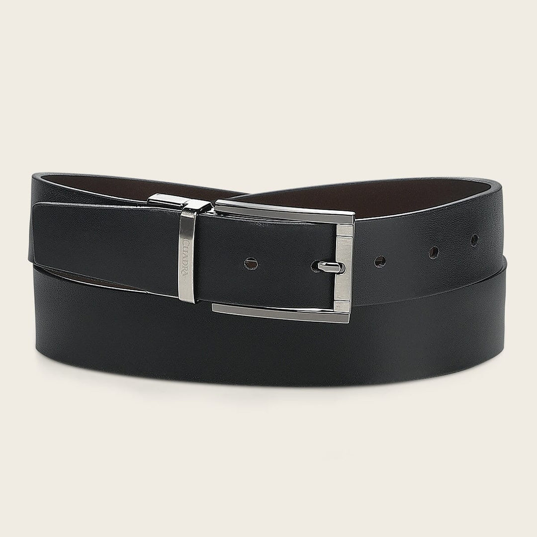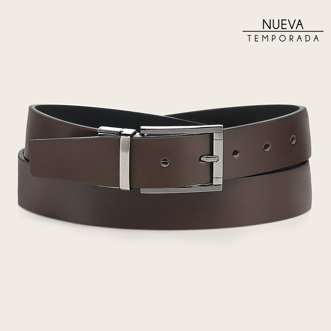 Cinturón reversible de vestir para caballero en piel genuina de bovino. Cuenta con una vista en color negro y la segunda en color café.