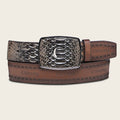 Cinturón vaquero para caballero en piel de bovino y piel genuina de pitón sobre la hebilla y en la punta de la tira. Presenta grabado láser de logotipo Cuadra y tejido artesanal en toda la tira. Con hebilla de 45 mm forrada en piel de pitón con apliación metálica de monograma Cuadra. Con forro en piel de bovino.
