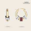 Aretes para dama en latón con baño de oro. Con aplicación de cuentas metálicas con acabado oro forradas en piel genuina de lizard y componentes Cuadra en acabado platino. Altura aproximada: 2.2 cm.