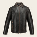 Chamarra para caballero en piel genuina de cordero. Presenta cuello camisero y acabado de la piel en contraste de color. Con dos bolsillos laterales con cierre y una aplicación metálica del monograma Cuadra en la parte trasera. Ajustada con cierre frontal. Con forro ligero.