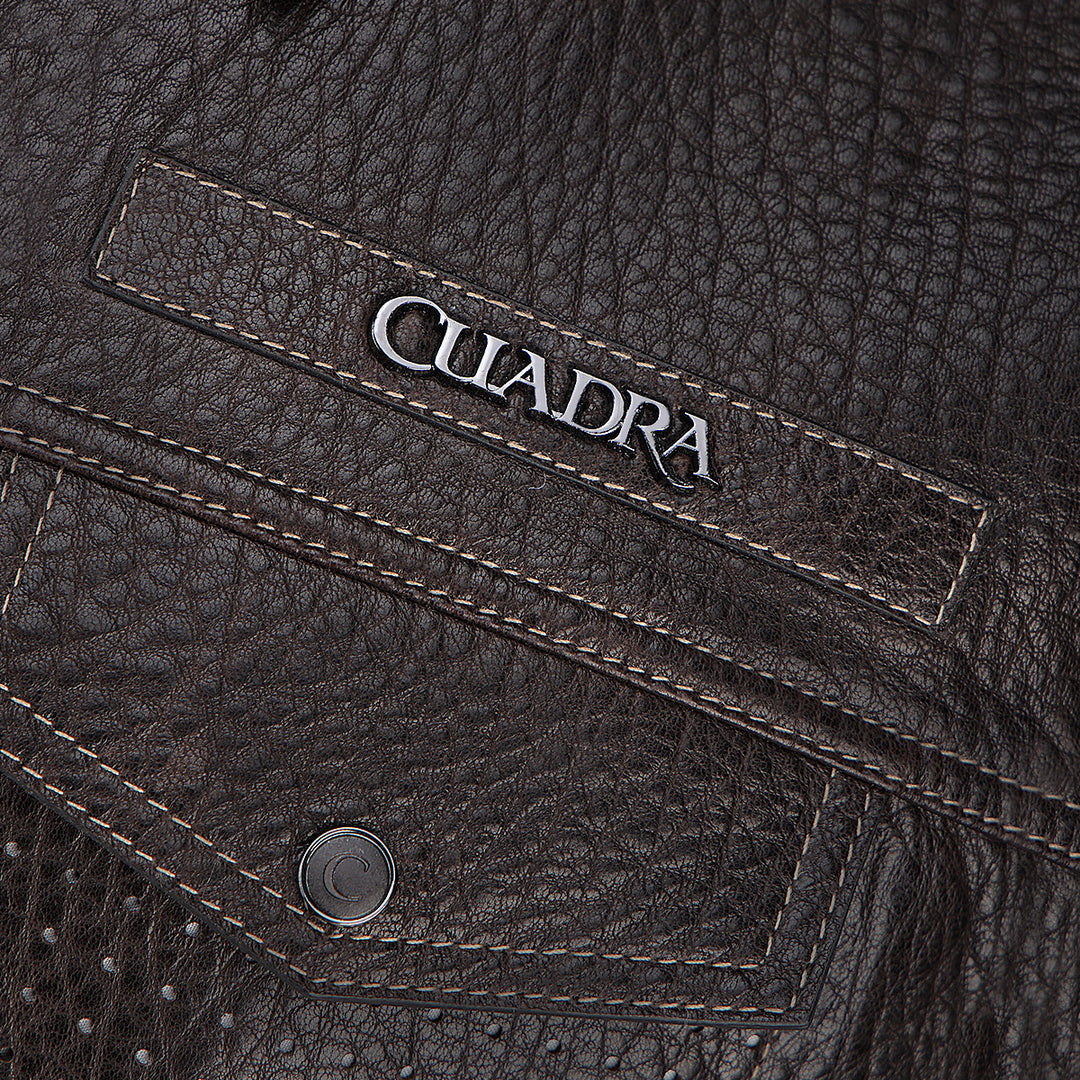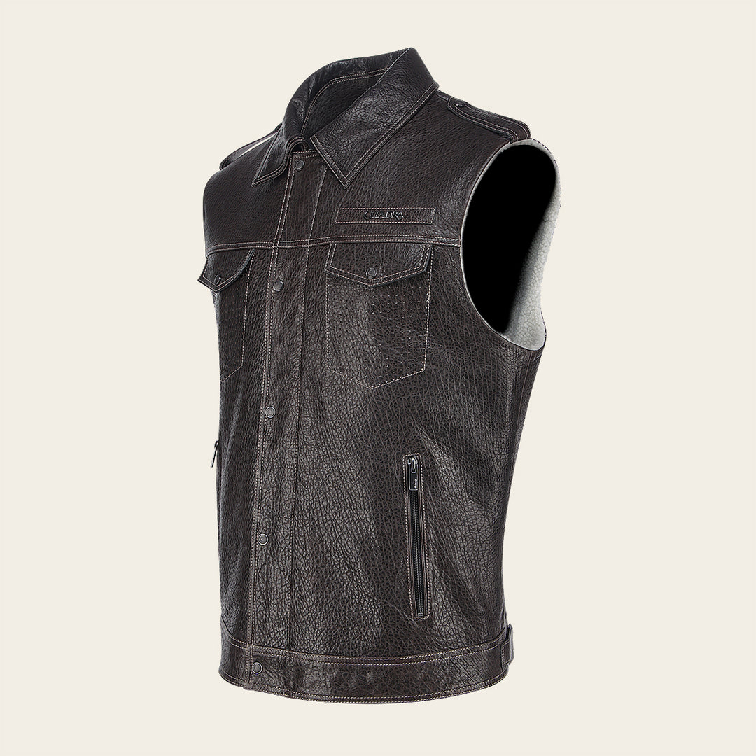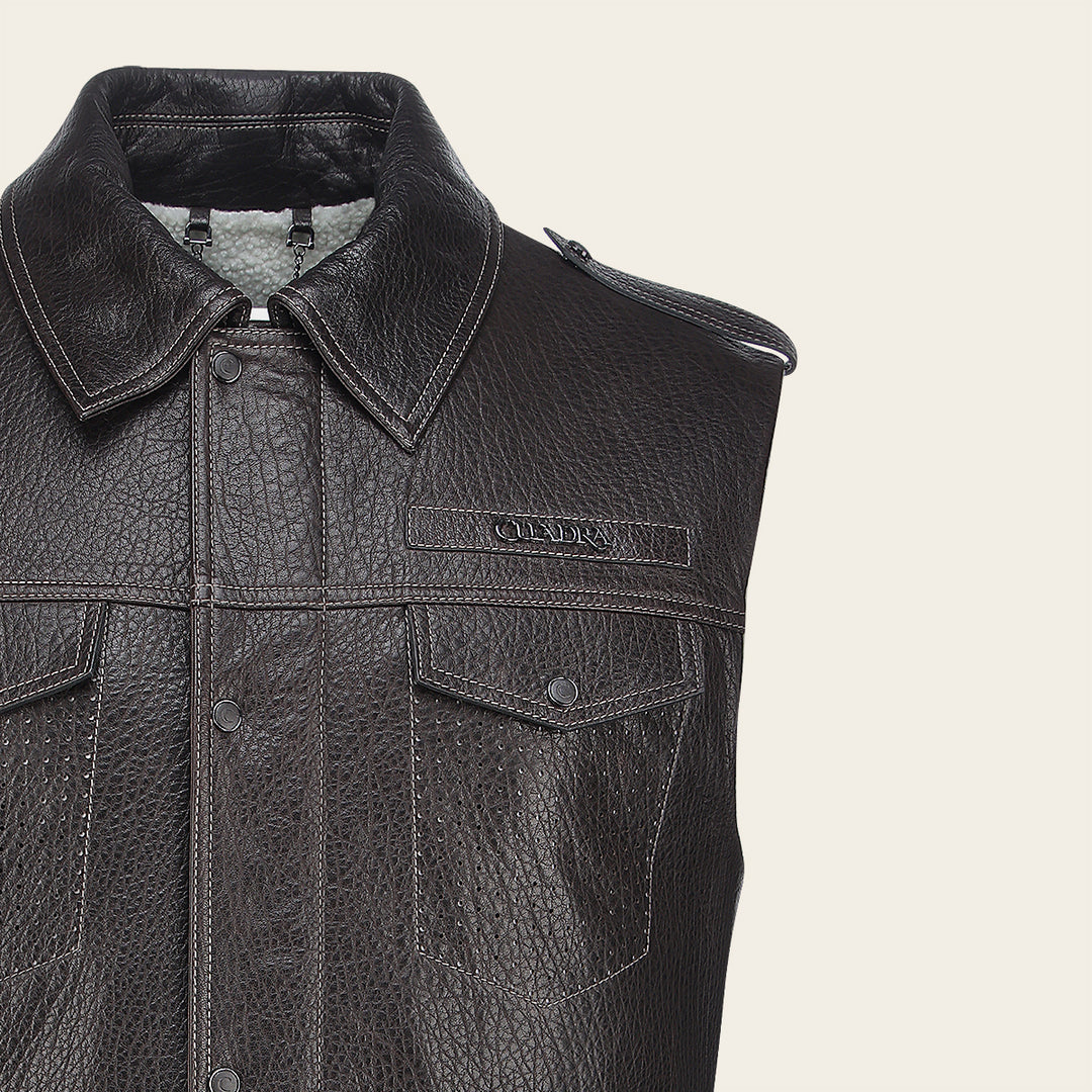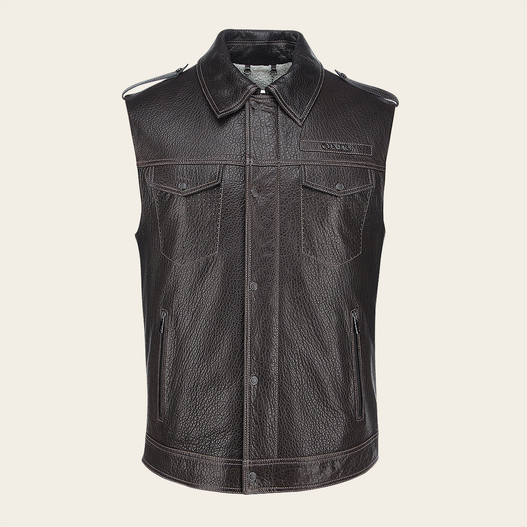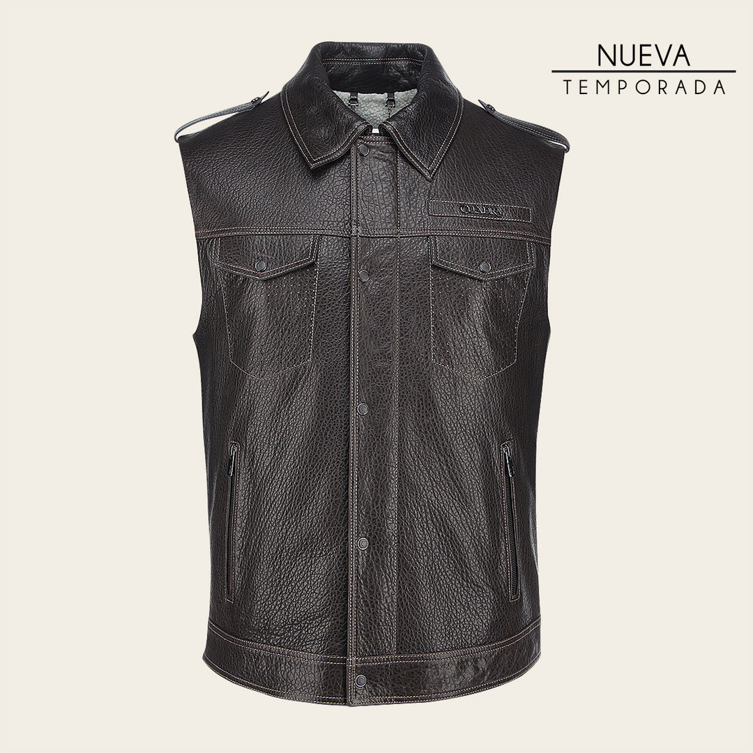 Chaleco para caballero en piel genuina de ovino. Presenta dos bolsillos laterales ajustados con cierre y dos frontales ajustados con broches, con aplicación metálica del logotipo Cuadra en pecho y dos correas en hombros ajustadas con broches. La parte interna con un bolsillo ajustado con cierre. Ajustada con broches de presión al frente.