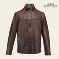 Chamarra para caballero en piel genuina de cordero. Presenta aplicaciones de piel en contraste de color y alto relieve. Con dos bolsillos laterales con imán y una aplicación metálica del monograma en la parte trasera. Ajustada con cierre y broches al frente. Con forro ligero.