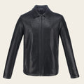 Chamarra para caballero en piel genuina de ovino. Presenta perforaciones, dos bolsillos laterales ajustados con cierre, aplicación metálica del monograma Cuadra en la parte trasera. La parte interna cuenta con dos bolsillos ajustados con cierre. Ajustada con cierre frontal.