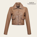 Chamarra para dama en piel genuina de ovino ultrasuave. Presenta dos bolsillos frontales asegurados con broches de presión con logotipo de Cuadra. Ajuste frontal con broches de presión. Con forro ligero.